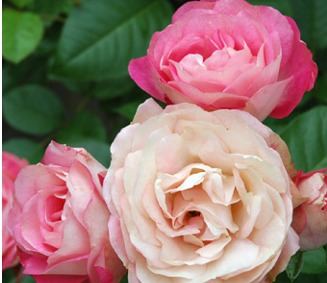 京成 アクロポリスロマンティカ シュラブ アンティークタッチ 四季咲き 花径7~8cm 樹高1.6 m 直立性 微香 表は白地に明るい桃の覆輪、裏弁はグレーがかったピンクで、咲くにつれグリーンがかる非常に独特な花色が魅力的です。5~7輪の房咲きになりブーケの様です。花付き花保ちは大変よいです。若い枝や茎は淡緑色で細立ちですが、枝はシュラブ状によく伸びます。つるバラとしても使えます。