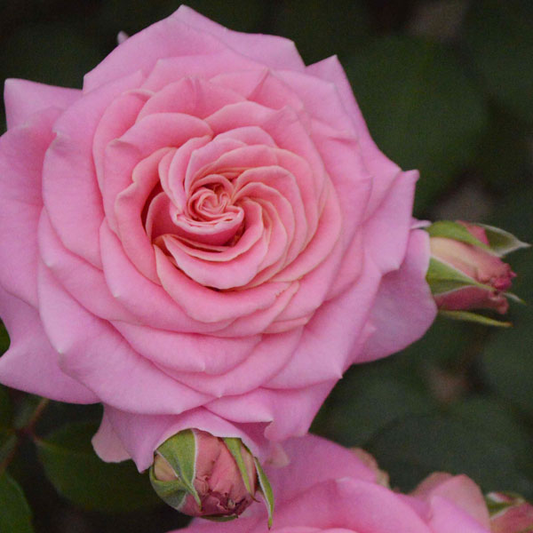 京成 アシュリー シュラブ樹形 花径10~12cm 樹高1.2m~1.5m 返り咲き 中香 華やかで花弁の多い、ボリュームのある大輪の花です。咲き始めは澄んだピンク、咲き進むとオレンジ味がかってきます。花つき、花もちが良く、花枝はトゲが少なくまっすぐ伸びるので、切花としても楽しめます。軽いティーの香りがあります。
