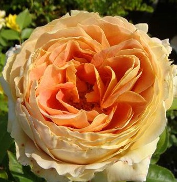 ハニーイエローから杏を含んだ花色が、なんともいえない魅力です。花は、花弁数もたっぷりの大輪でボリュームがあり、開ききるまでのプロセスをじっくり楽しめます。咲き始めはカップ咲きで、咲き進むと中心部の杏色が濃いクォーター咲になります。心地よい香りもあり、たくさんの魅力を兼ね備えています。もとは人気のある切バラ品種のため、ステムもまっすぐで棘が少なめで扱いやすく、アレンジメントでも楽しめます。
