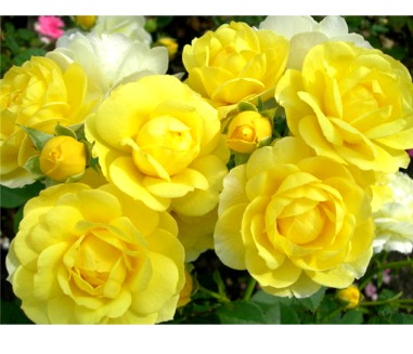京成 ゴールデンボーダー FL 修景 四季咲き 花色:黄 花形:カップ咲 花径:5~7cm 樹高:0.5~0.7m 中香 花つきがよく、棘の少ない品種なので扱いやすく、しかも丈夫なので手軽にブーケのような房咲きと、丸みを帯びた花形が楽しめます。香りもあって魅力あふれる品種です。より多く花を咲かせるには、夏は咲きがら摘みのみにし、冬も剪定しないのがポイントです。