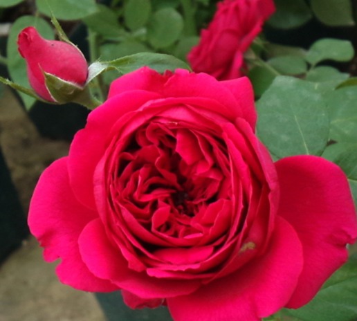 京成 ルージュ ピエール ドゥ ロンサール CL アンティークタッチ 花色:クリムゾンレッド 花形:ロゼット咲 花径:10cm 樹高:1.8~2.0m 強香 印象的なクリムゾンレッド色の花は、ゴージャスな大輪で、それにふさわしい濃厚な香りがします。「スミレのニュアンスにスパイシーさを含んだダマスクの香り」と評されました。四季咲き性のつるバラで、1つの茎に1~5輪と花付きも良く、葉は照り葉です。冬の時期に短く剪定しても春に咲きます。