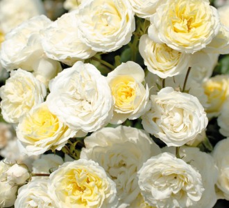 バニラボニカ シュラブ 花径6~7cm 樹高 1.5m~1.8m 四季咲き ブーケのごとく房咲きになって咲きます。バニラ味のソフトクリームのような色合いの花。成長が旺盛で樹高は高め、どんなシーンにも自然に調和します。ホワイトガーデンにおすすめ。花弁数:35~40枚位で半剣弁平咲きです。 半つる性ですがフロリバンダローズにも分類されます。