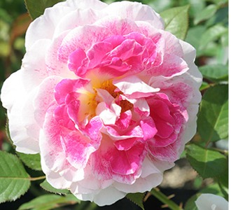 京成 ホリデーアイランドピオニー HT 四季咲き 花色: 白地にピンクの覆輪 花形: 丸弁ロゼット咲 花径: 10 cm 樹高: 0.8 m 樹形: 横張り性 微香 珍しい花色の、しゃくやくのように華やかな雰囲気を持つバラです。白地にローズピンクが、絵の具を吹き付けた模様のようにのり、華やかな中にも可愛らしい雰囲気を持ちます。房で咲くことがあります。樹形はコンパクトで、鉢にも向きます。